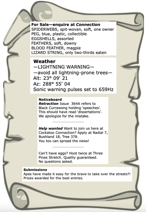 Don’t forget—anyone interested in Black Currawong’s speeches can find her lecturing every day in The Big Green.